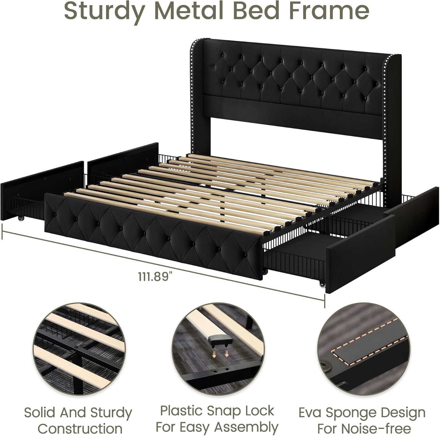 King Size Bed Frame with 4 Storage Drawers and Tufted Headboard Velvet Upholstered Platform Bed Frame Wingback Beds with Wooden Slats Support, Easy Assembly, Black