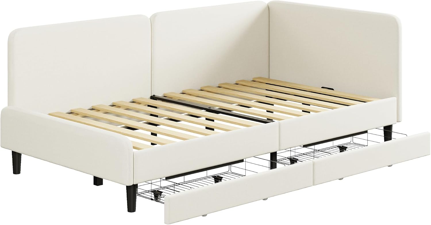 LIKIMIO Twin Daybed with Headboard, Corner Bed Frame with Bed Rails and Storage Drawers, Solid Support, for Bedroom Guest Room, Cream