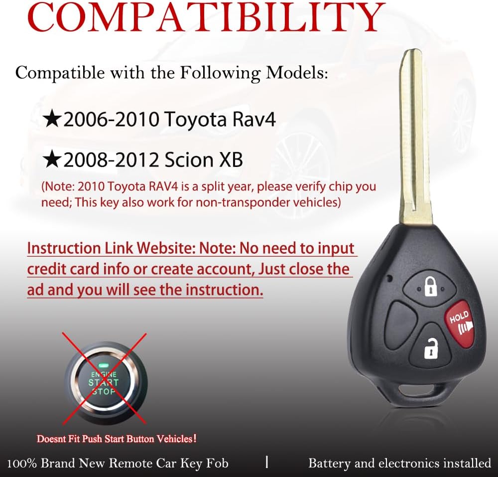 ★REPLACEMENT: This Remote Key Fob Replacement is Compatible with 2006-2010 Toyota Rav-4 and 2008-2012 Scion XB. Please Check Our Product Description and Vehicle Fitment Tool for Full Compatible Vehicles List.