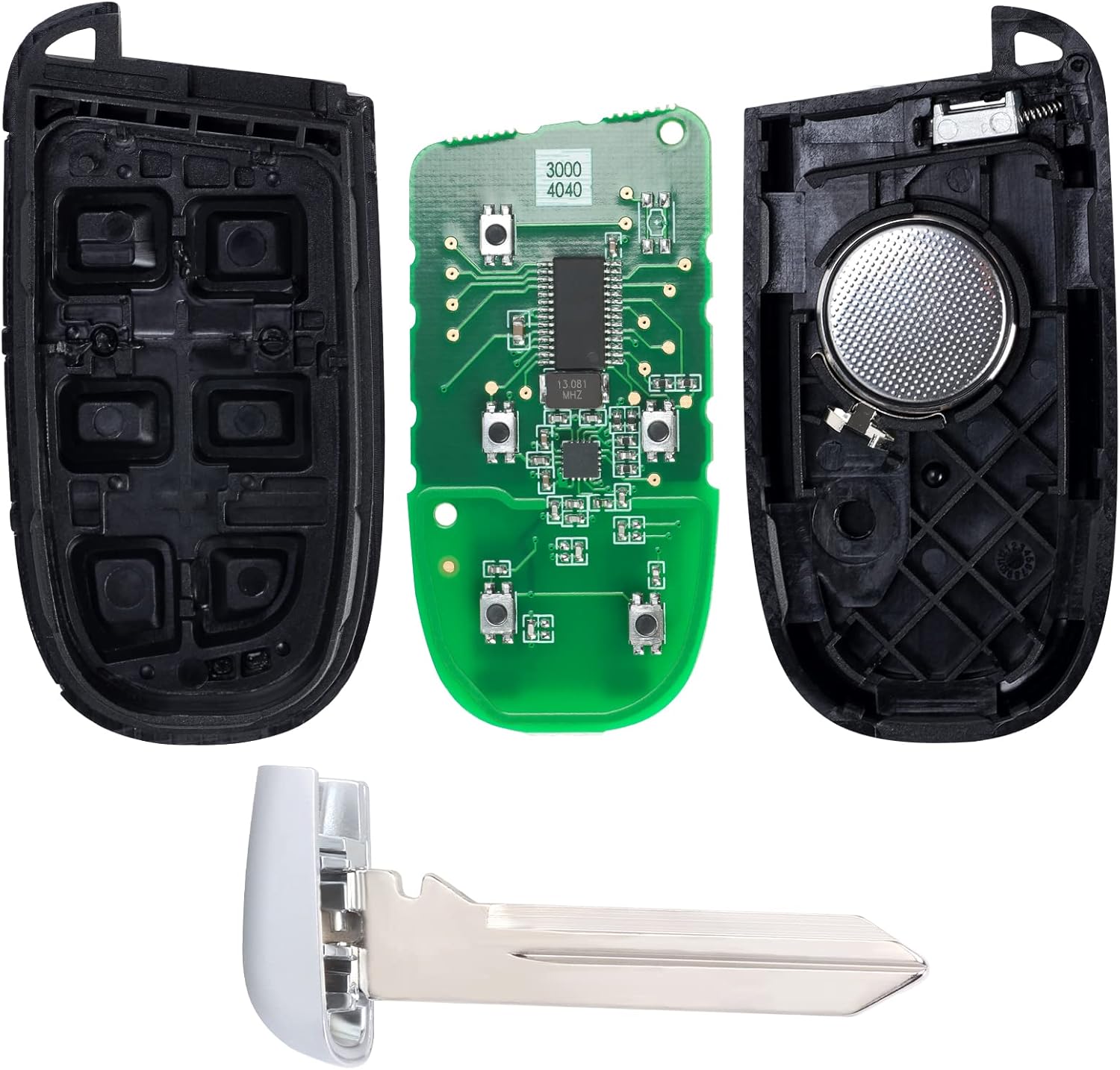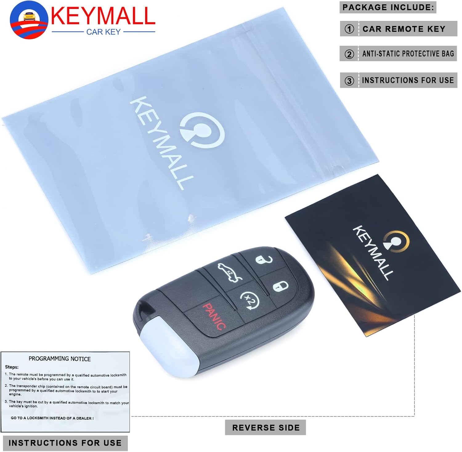 Work as OEM:This is an aftermarket replacement key,there is no logo or emblem on the back.Each of key fob comes complete with battery/chip/circuit board/uncut key blank