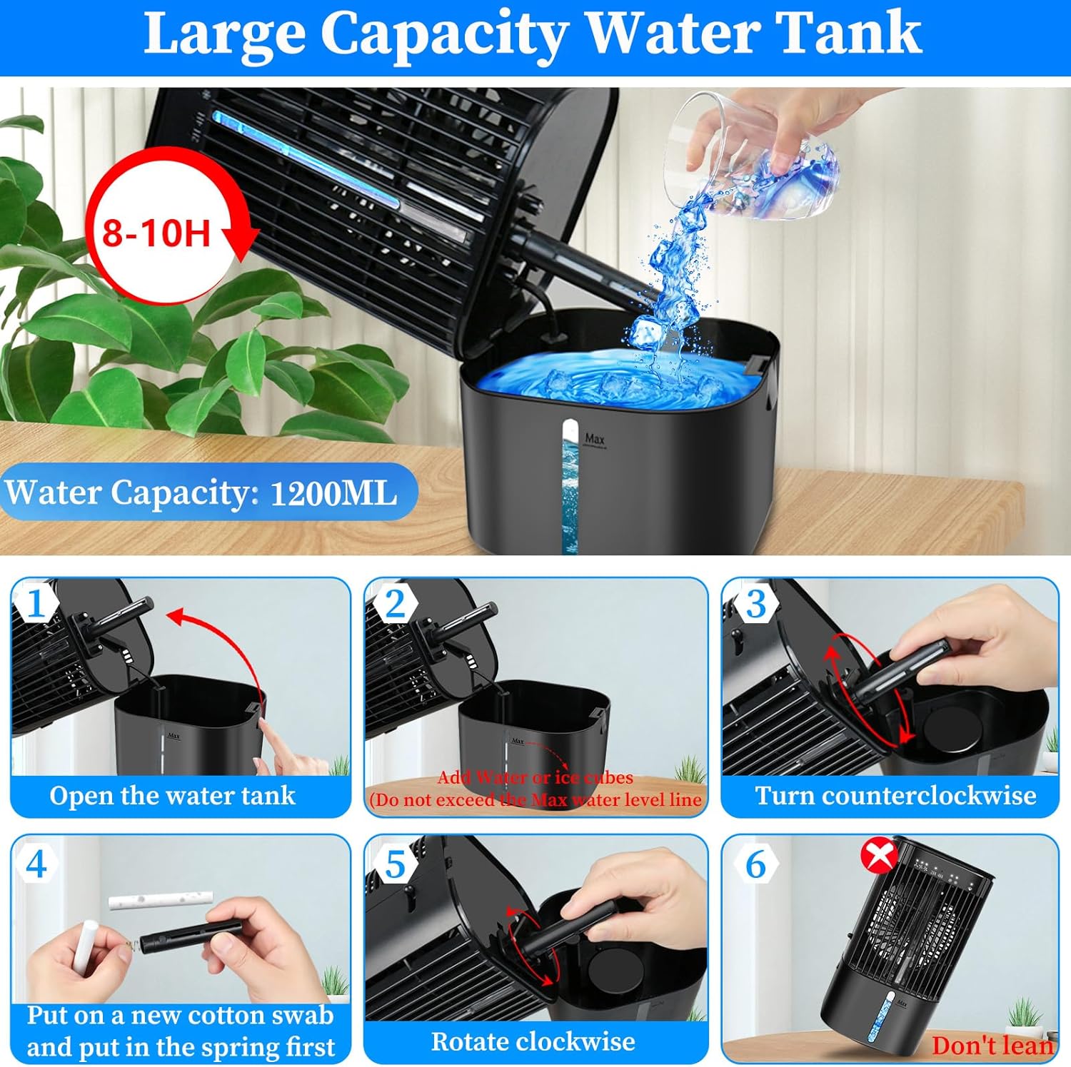 ❄️【Large Water Tank & LED Night Light】The evaporative cooler comes with a 1200ml large-capacity sealed water tank (not exceeding the maximum water level), and the room portable air conditioner can work for up to 8 hours when filled with water (low cooling mist mode). The built-in LED atmosphere in seven colors has the function of a night light for sleep. Two auto-off modes: 2/4 hours. You can adjust the light to your intention to improve sleep quality.